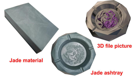 Below,the two on the left are the jade material and 3d file picture, The right picture is jade ashtray sample after engraving.