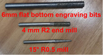 These are our experimental procedures, which mainly include three aspects: rough engraving by 6mm flat bottom engraving bits and 6mm flat bottom engraving bits,accuracy engraving by 4mm R2 end mill and 15° R0.5 flat bottom engraving bits
